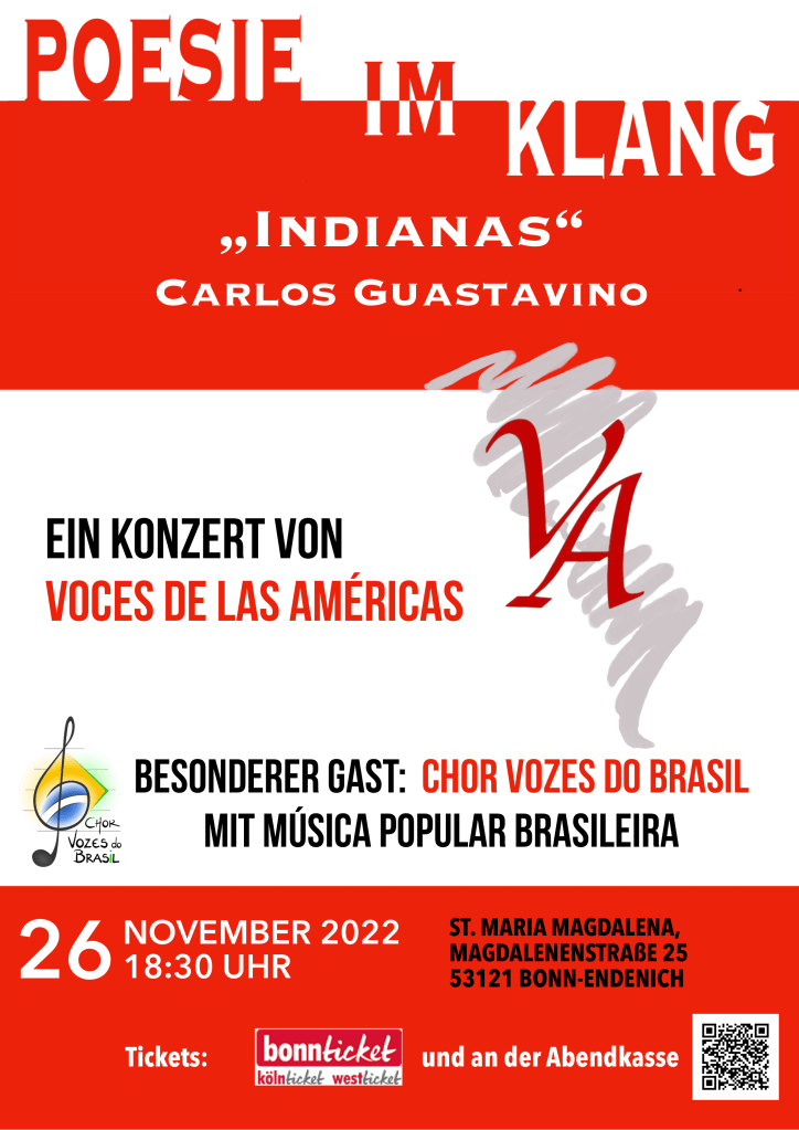 2022: Unter dem Motto „Poesie im Klang“ präsentierten wir Guastavinos berühmten Liederkanon „Indianas“ und typische von ihm vertonte Volkslieder. Dazu kamen Werke der Música popular Brasileira, gesungen vom Chor Vozes do Brasil.